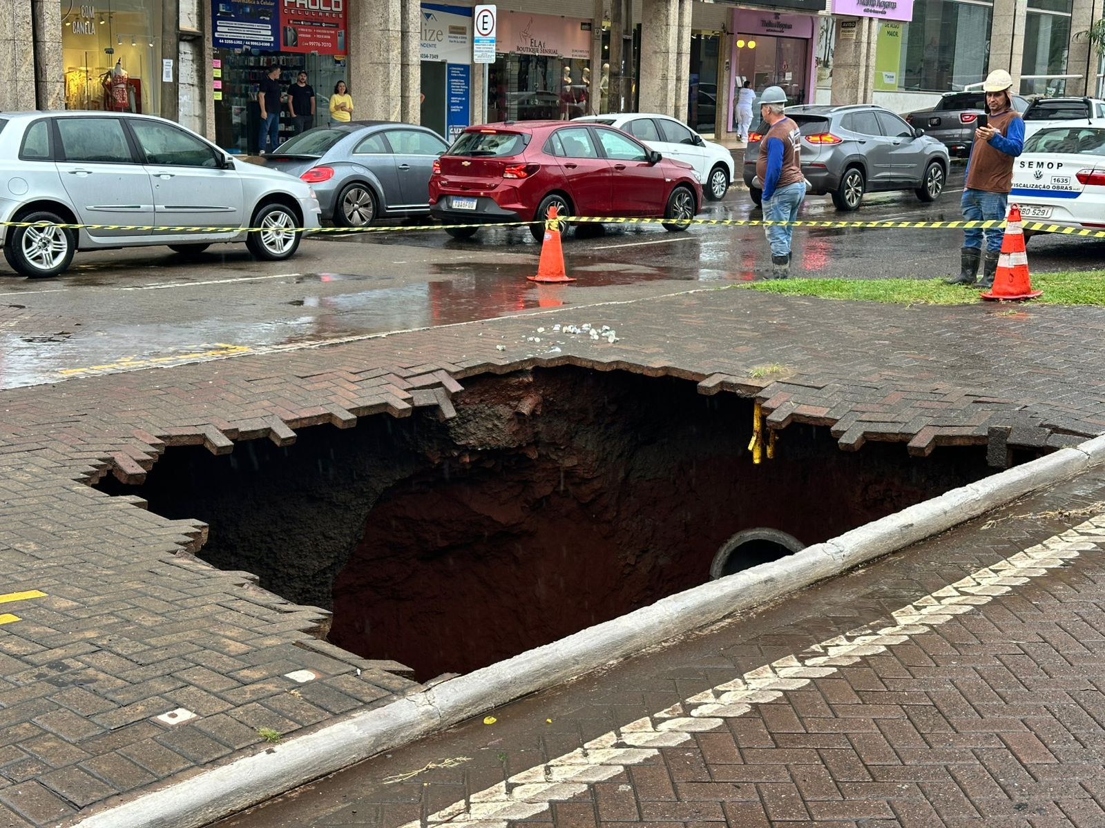 Trânsito por Redação CBN Maringá em 13/10/2025 - 09:52Uma cratera de grandes proporções se abriu no canteiro central da Avenida São Paulo no centro de Maringá, bem em frente ao Shopping Avenida Center. O repórter Vitor Oliveira, da Maringá FM, esteve no local.