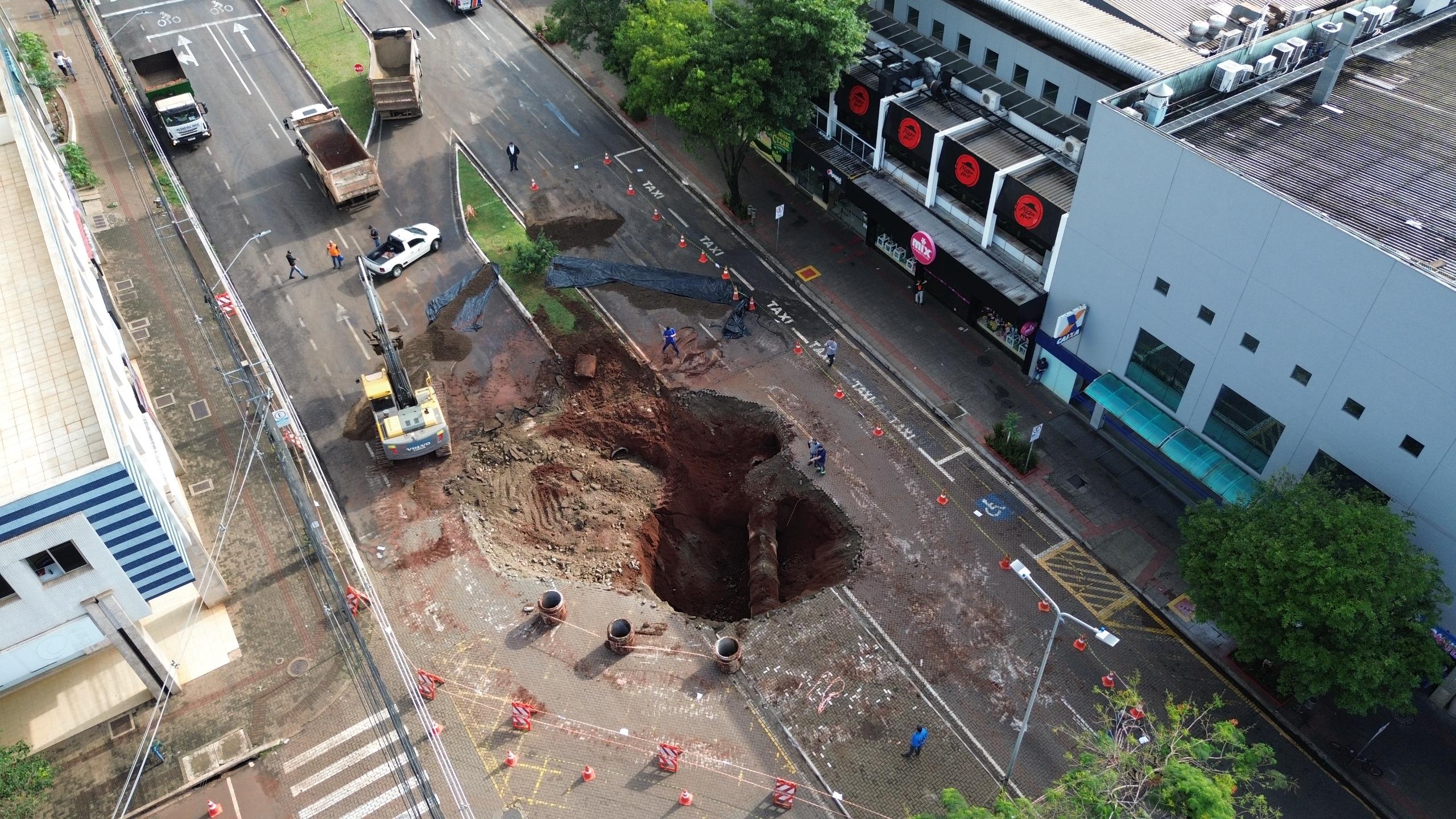Nesta terça-feira (14), máquinas e operários trabalham na Avenida São Paulo para restaurar o canteiro central engolido por uma cratera.
